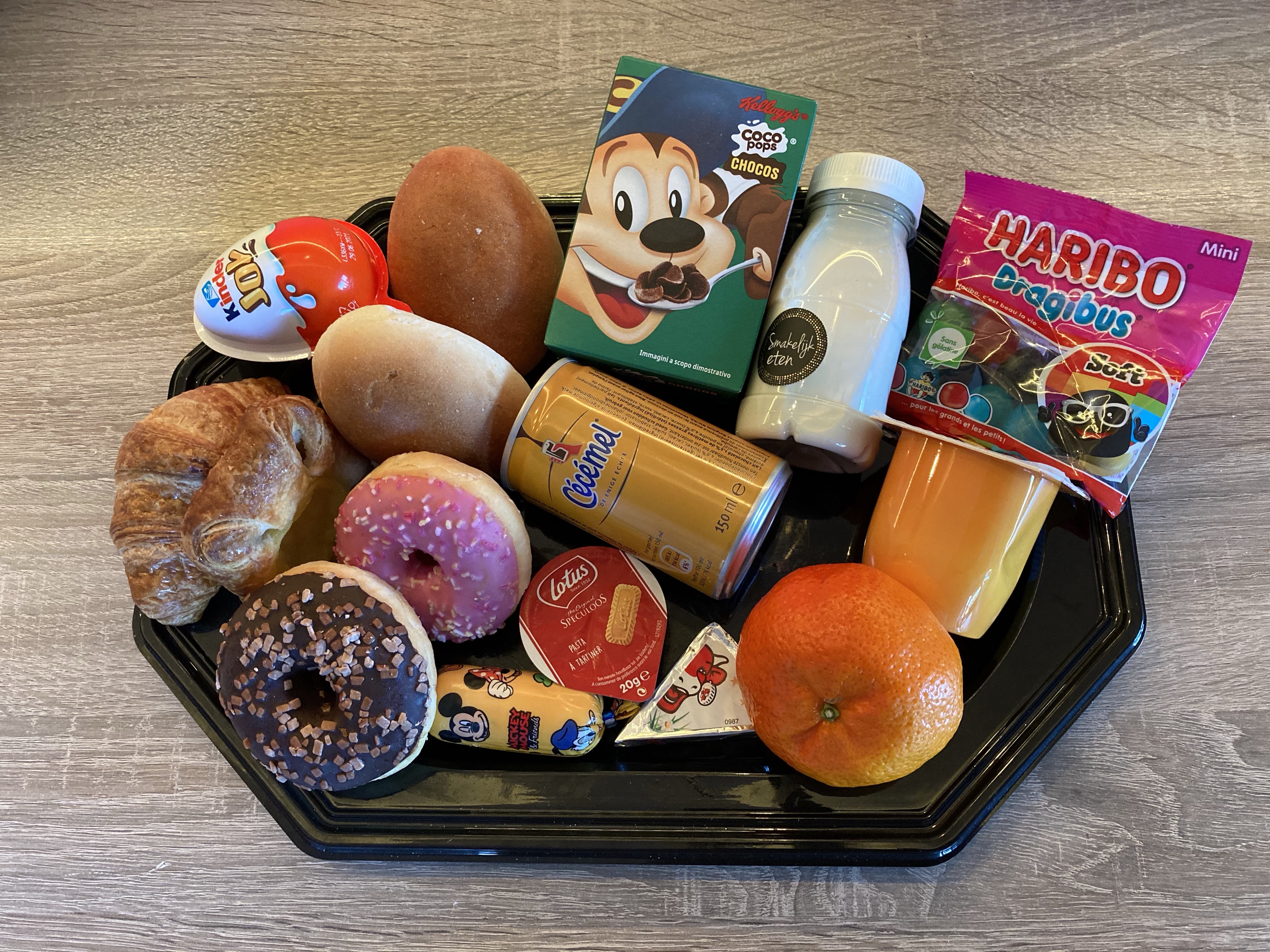 2 Sandwiches, 1 Mini croissant, 1 Mini koffiekoek, 2 Donuts, boter, Kalfswortje, Speculaaspasta, Smeerkaas, Kinderei, Yoghurt, Cécémel, Ontbijtgranen met verse melk, Stuk vers fruit, Snoepjes voor na het ontbijt.